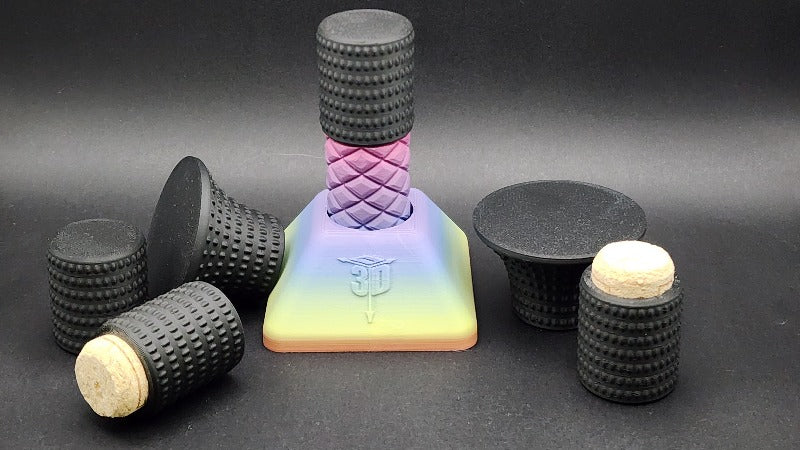 This bundle includes our original Paint Handle Pro paint handle, printed in a beautiful rainbow PLA+ filament. Also included is a base for the handle to sit in. If you knock a model attached to the paint handle, the base helps prevent tip overs and will slide across the desk. Alternatively, use the double sided tape pad to secure the base in a specific location. Also included are 2 regular slim tops, 2 wide brimmed tops and 2 of our new cork tops (for all you sub assembly/painting friends out there).